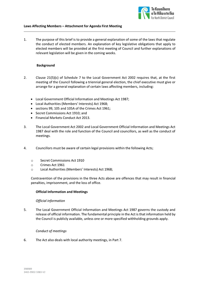 At the first meeting following a triennial local election, elected members are required to receive a general explanation of key laws that apply to elected members. This report provides a brief of the key legislation as required under, under Clause 21 (5)(c) of Schedule 7 of the Local Government Act 2002.