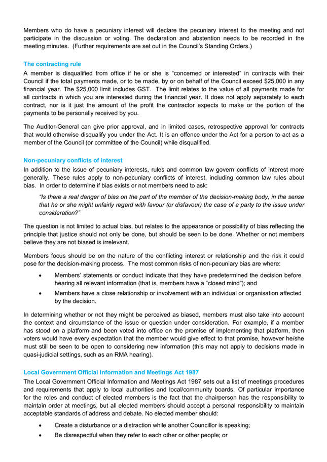 As part of your induction, the Chief Executive is required under the Local Government Act to arrange an explanation of key legislative obligations that apply to you as elected members. This ensures you understand your responsibilities and avoid any risk of prosecution or disqualification.