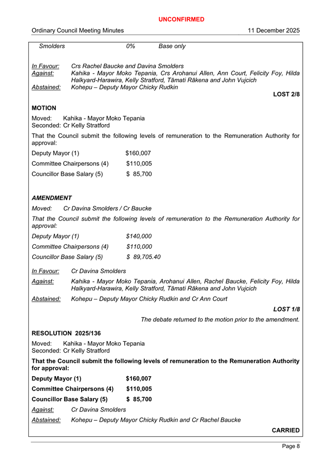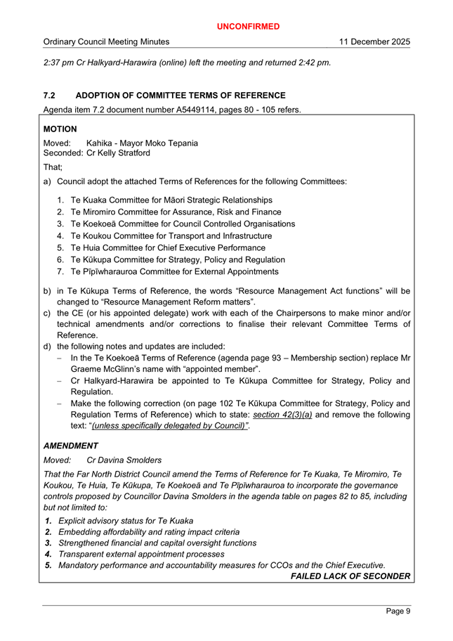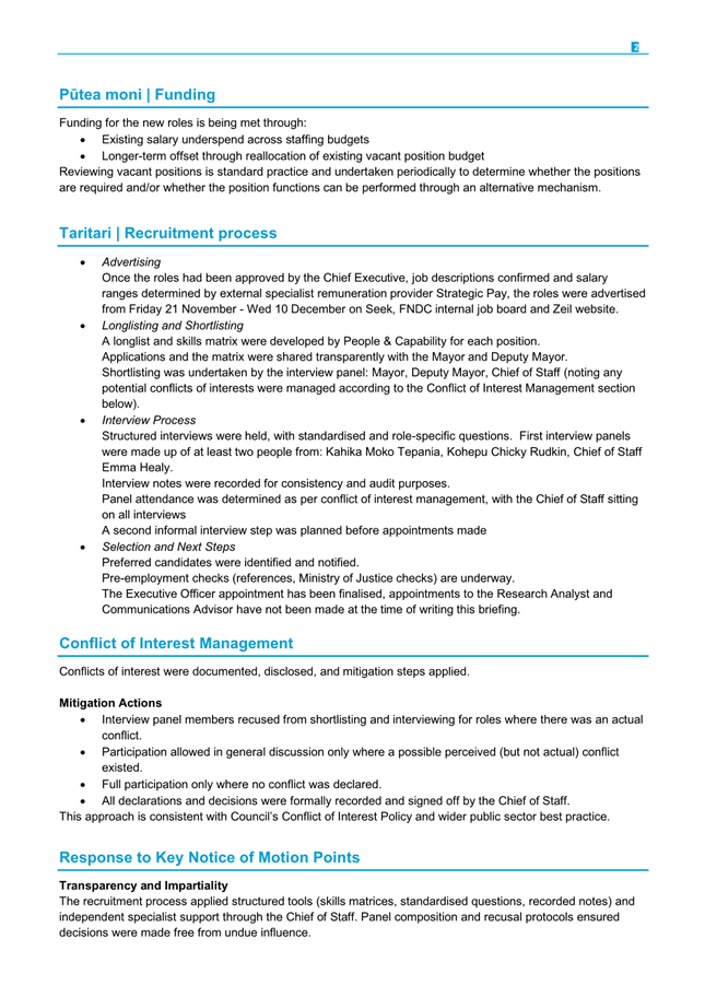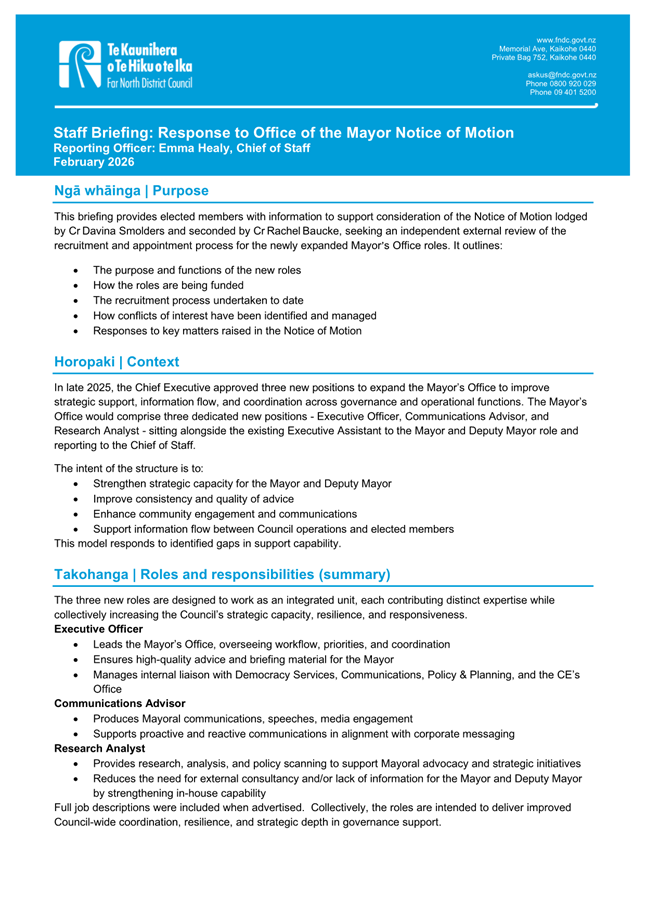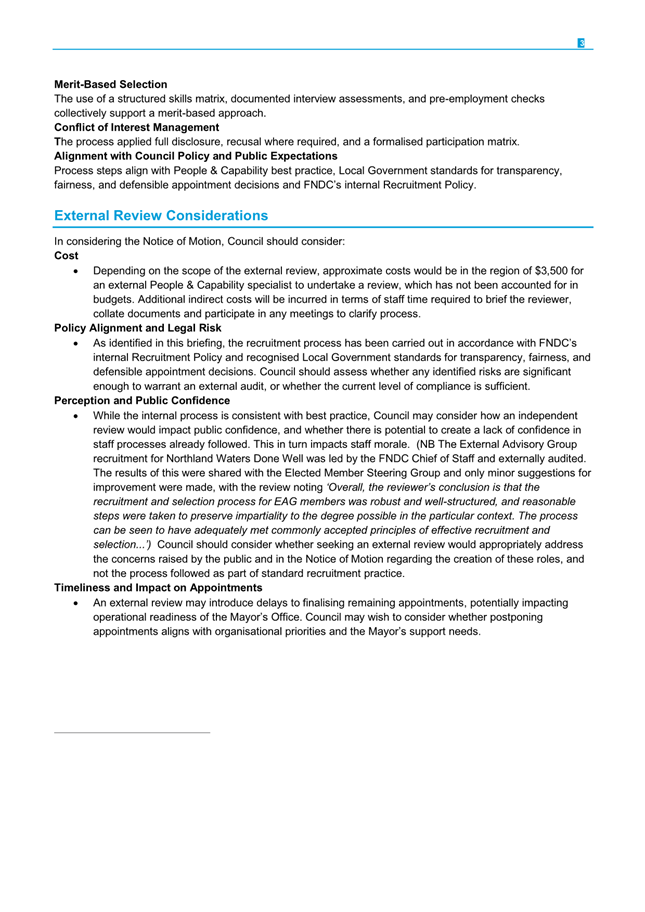 That the Far North District Council: 1. Notes the recently advertised recruitment for three positions within the Mayor’s Office. 2. Requests that an independent external review of the recruitment, shortlisting, and appointment process be commissioned prior to final appointment decisions being confirmed. 3. Directs that the review assess: · Whether the recruitment and selection processes are robust, transparent and impartial · Whether the process reflects widely accepted standards of merit-based appointment · Whether steps have been taken to manage potential conflicts of interest, perceived or actual · Whether the process aligns with Council policies, Human Resources best practice, and public expectations for positions funded by ratepayers 4. Requests that the findings of the independent review be reported to the full Council and made publicly available, subject to lawful privacy requirements. 5. Requests that no appointment be finalised until the review findings have been presented to Council. 6. Requests that, where practicable, Council pause final appointments until the review findings are received. 7. If the appointments are made prior to this Notice of Motion being heard or resolved, requires that the external review still proceed and examine the full process retrospectively, with recommendations for improvement (if any) reported to Council.