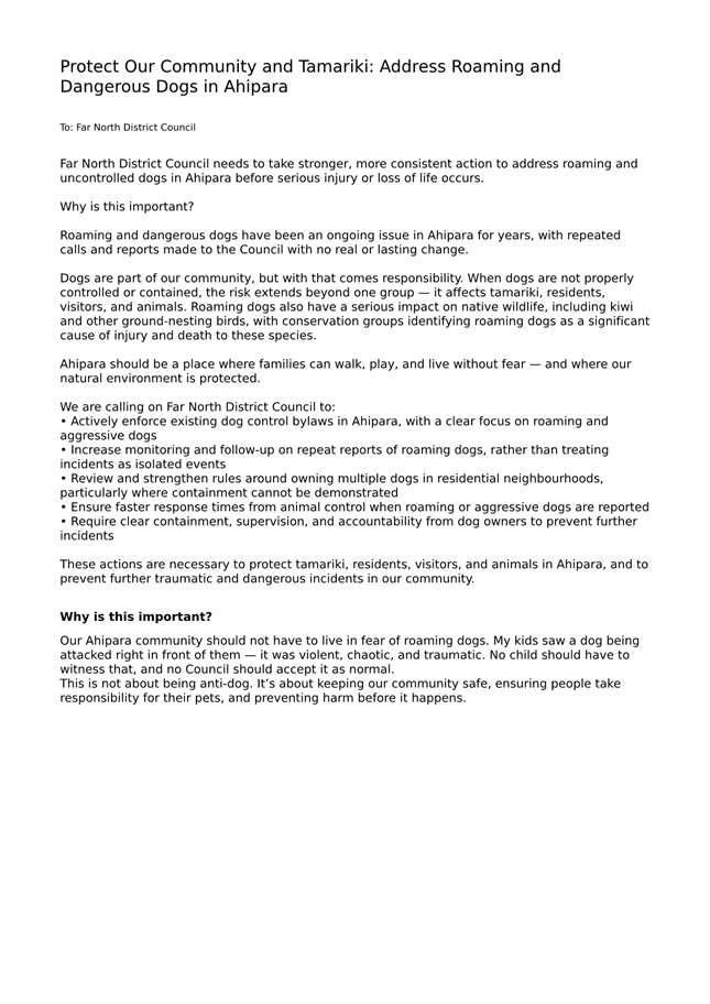 8.1 Petition - Protect Our Community and Tamariki: Address Roaming and Dangerous Dogs in Ahipara