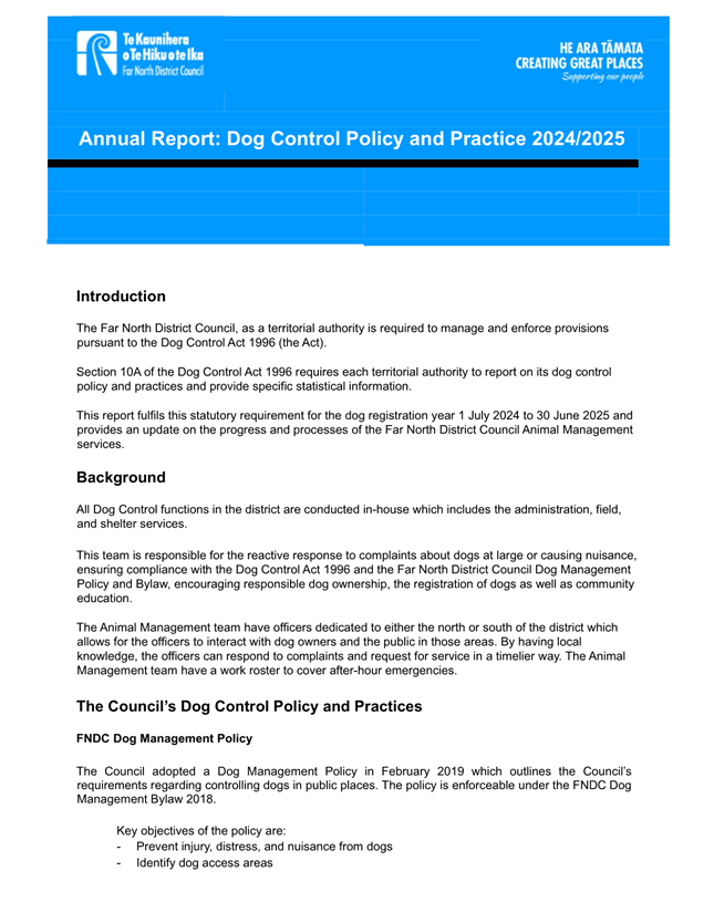 Section 10A of the Dog Control Act 1996 requires each territorial authority to report on its dog control policy and practices and provide specific statistical information.