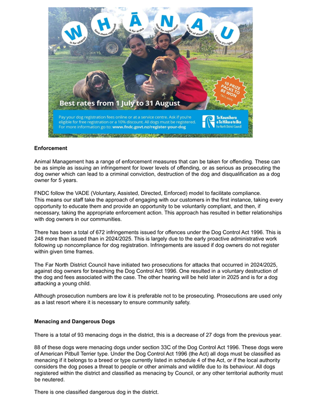The Far North District Council have initiated two prosecutions for attacks that occurred in 2024/2025, against dog owners for breaching the Dog Control Act 1996. One resulted in a voluntary destruction of the dog and fees associated with the case. The other hearing was held late in 2025, for a dog attacking a young child. A sentencing date is set in February 2026.