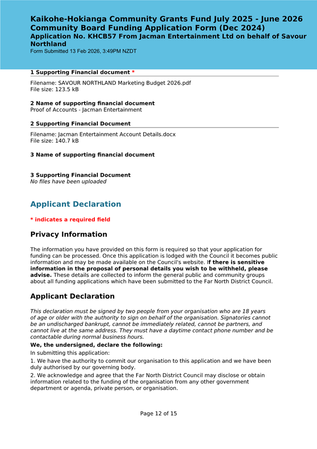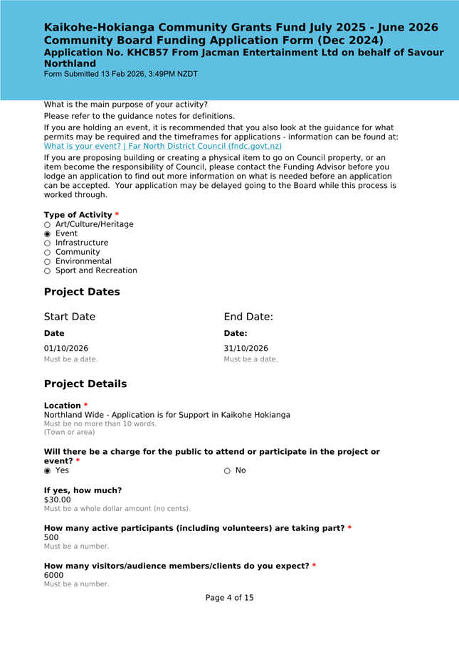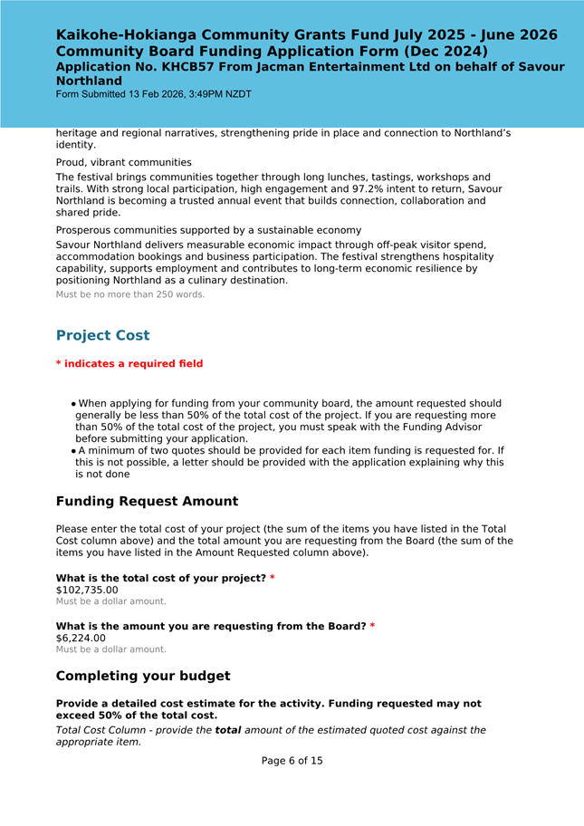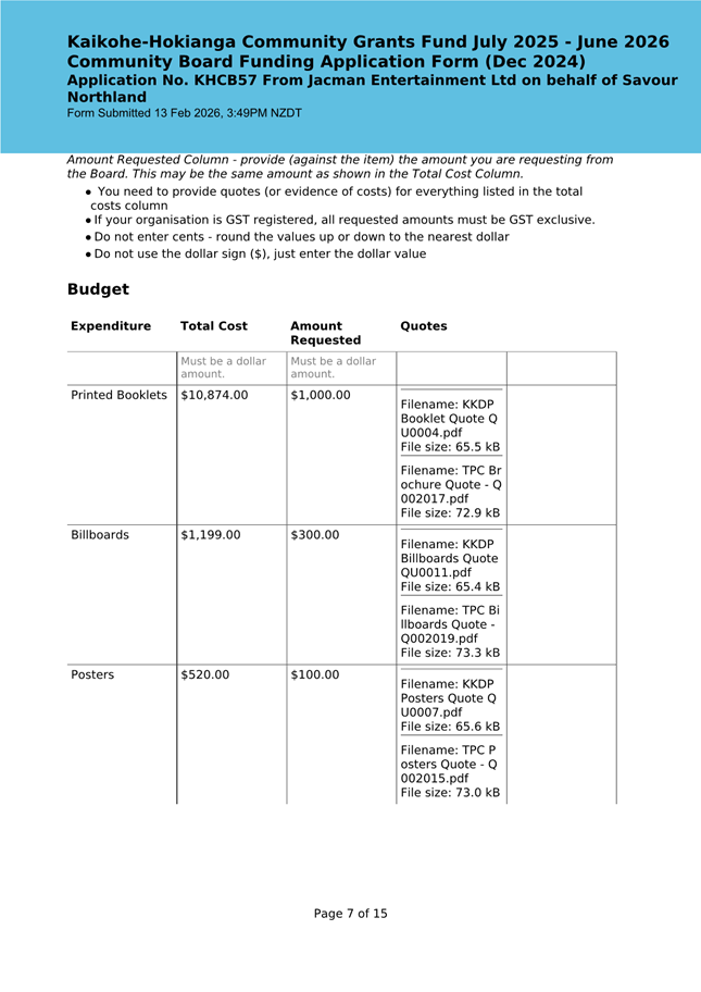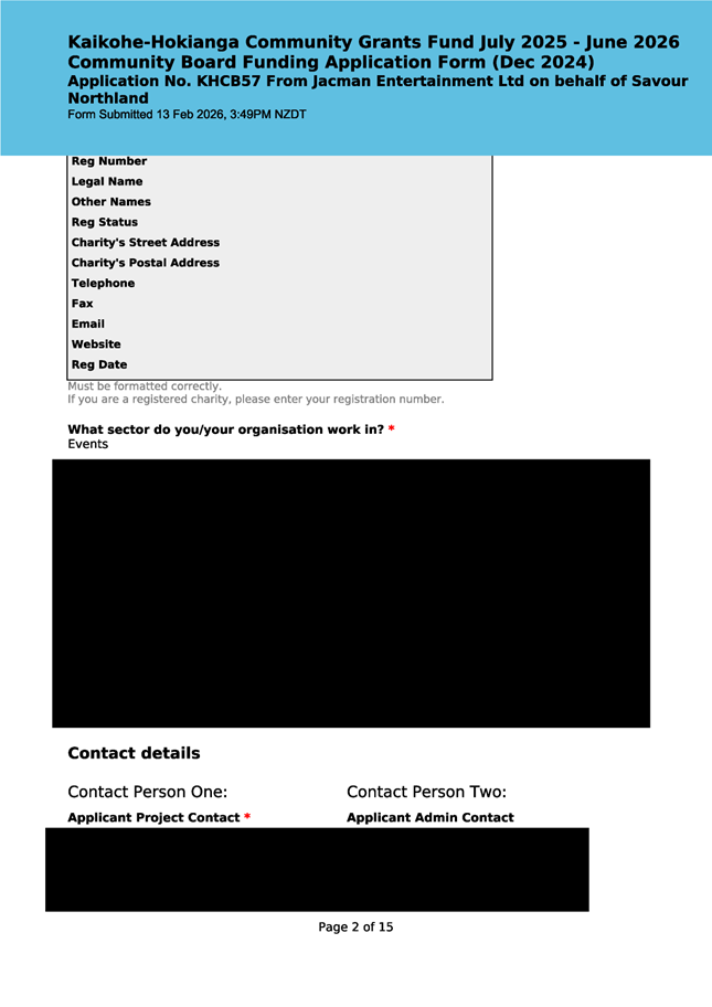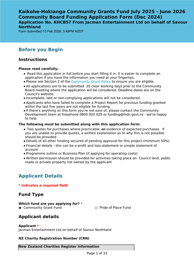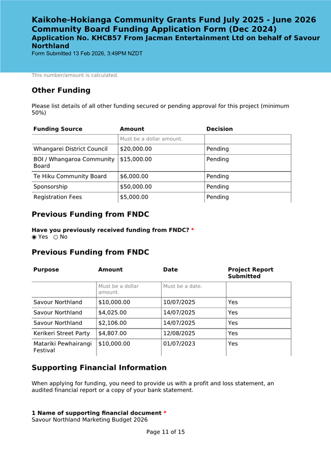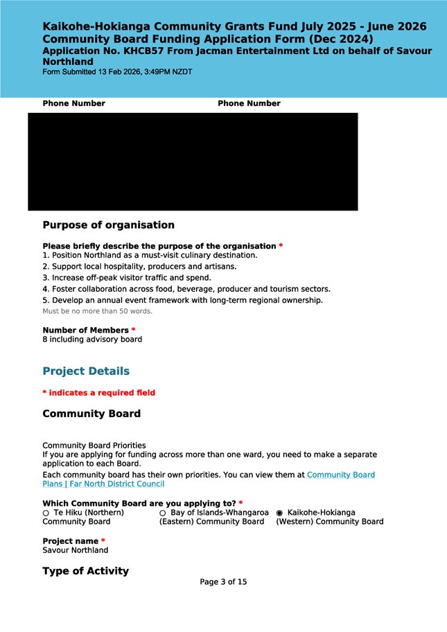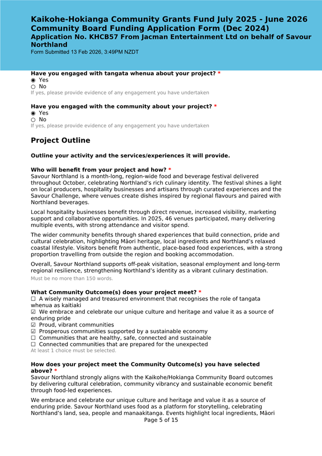 The applicant is seeking funding for the Savour Northland food festival for promotion and events in Kaikohe-Hokianga Ward. The Board granted the applicant $2,106 to the applicant for the 2025 festival. The applicant has been granted $4,000 by Te Hiku Community Board for the 2026 event, and $15,379 for both the 2026 and 2027 event by Bay of Islands-Whangaroa Community Board (both from their 2025/26 funding budget. This application was left to lie at the March 2026 meeting and the applicant has provided additional supplementary information which is included in the confidential information circulated to the Board under separate cover. This meets community outcomes 2,3,4,5 |