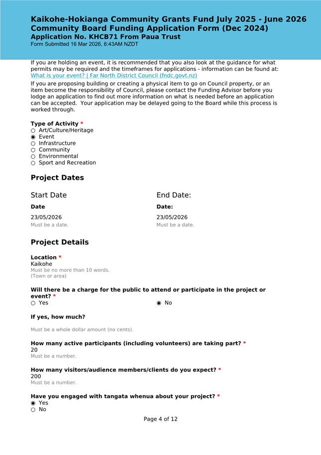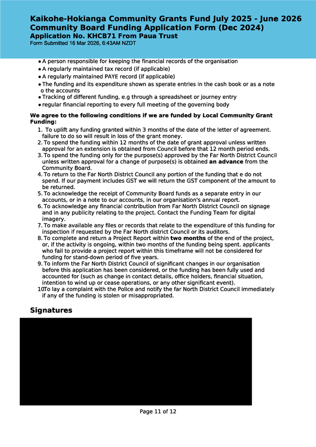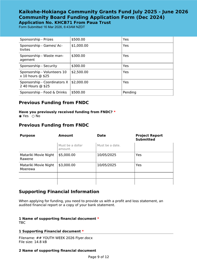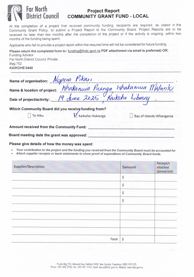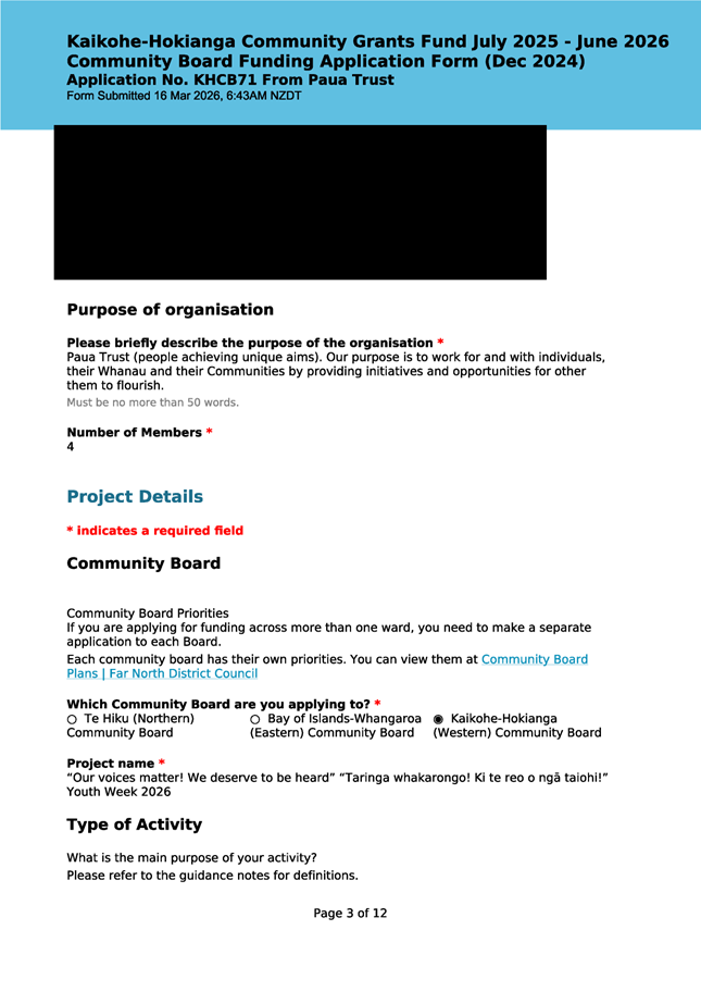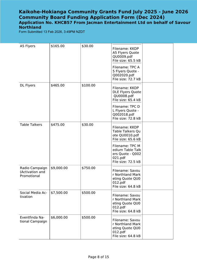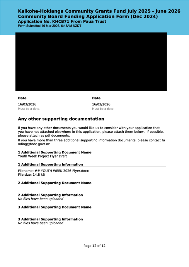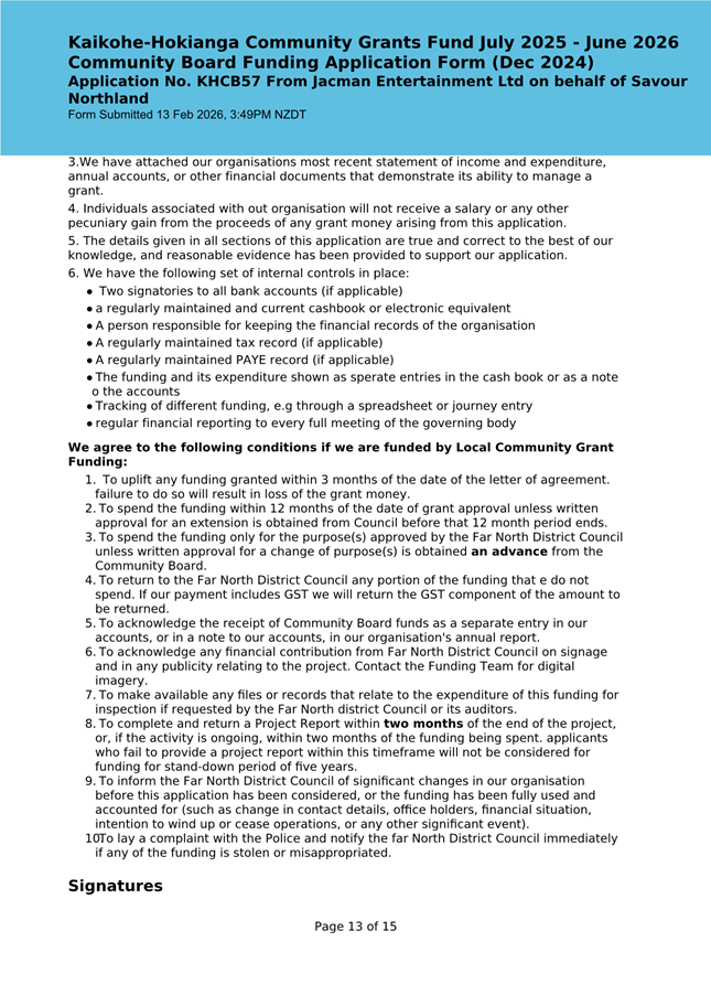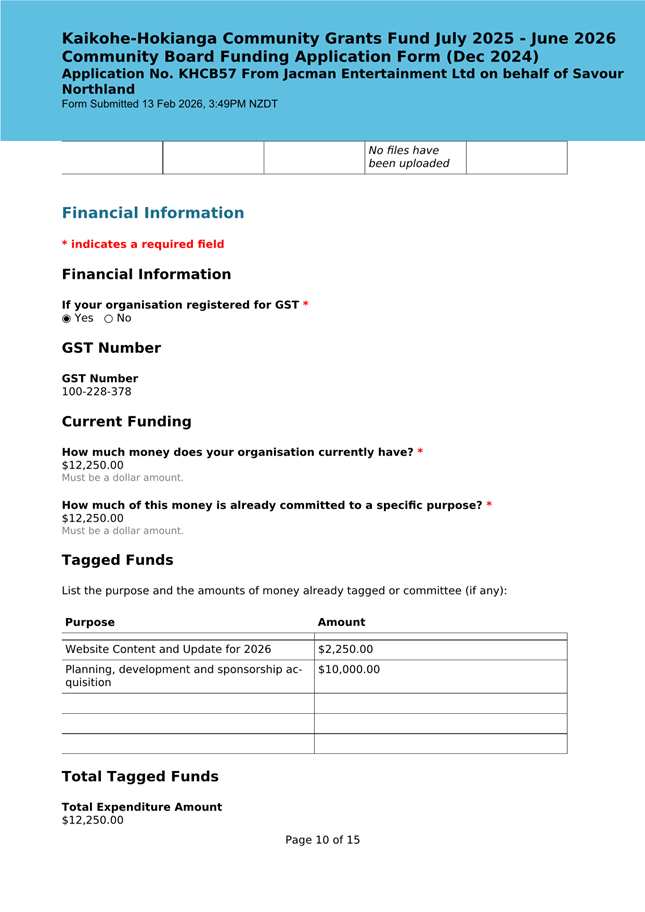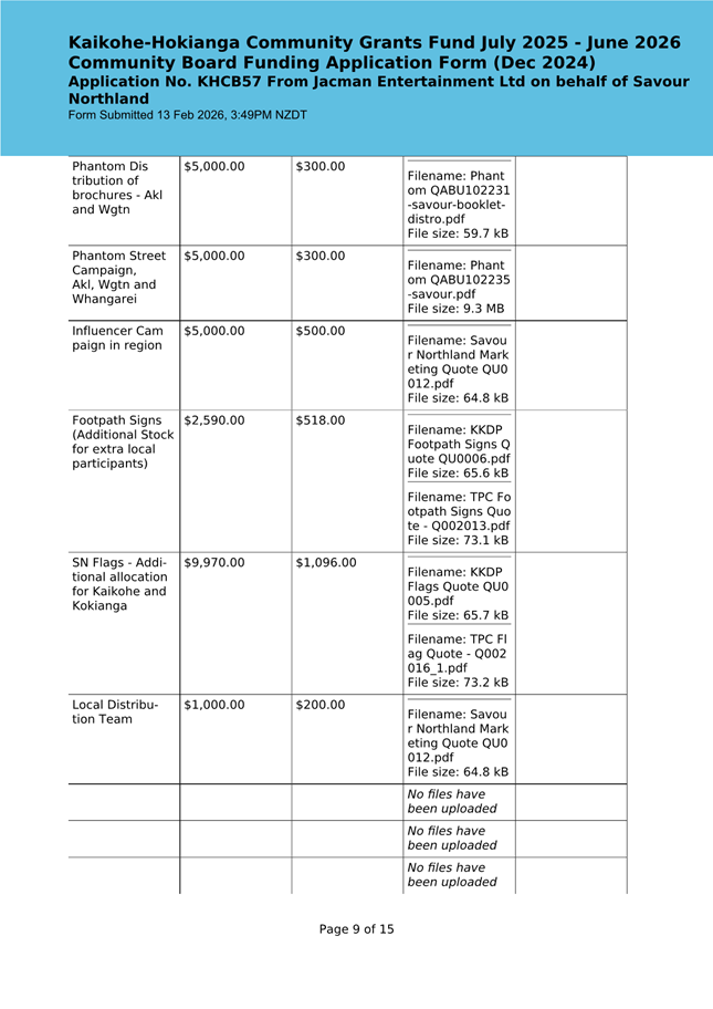 The applicant is seeking funding for the Savour Northland food festival for promotion and events in Kaikohe-Hokianga Ward. The Board granted the applicant $2,106 to the applicant for the 2025 festival. The applicant has been granted $4,000 by Te Hiku Community Board for the 2026 event, and $15,379 for both the 2026 and 2027 event by Bay of Islands-Whangaroa Community Board (both from their 2025/26 funding budget. This application was left to lie at the March 2026 meeting and the applicant has provided additional supplementary information which is included in the confidential information circulated to the Board under separate cover. This meets community outcomes 2,3,4,5 |