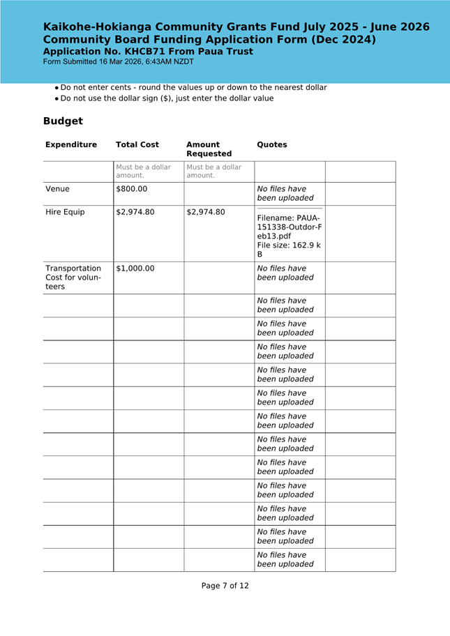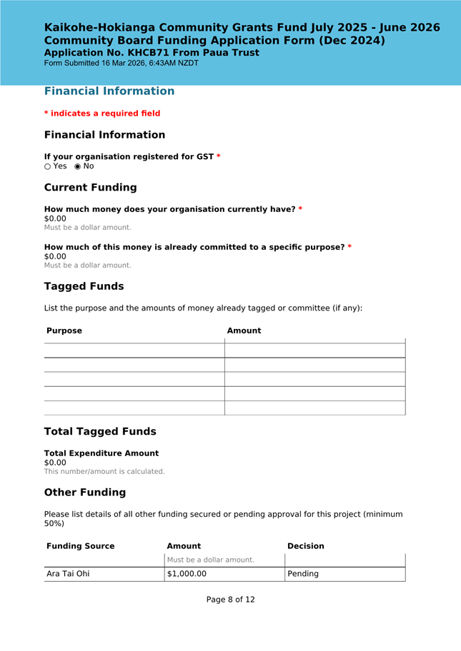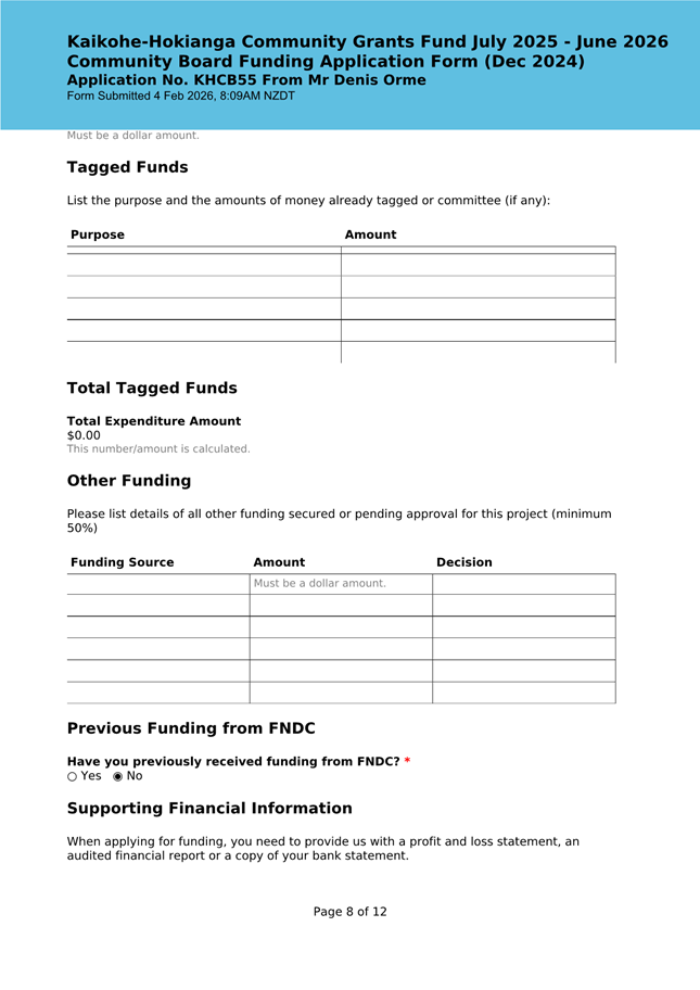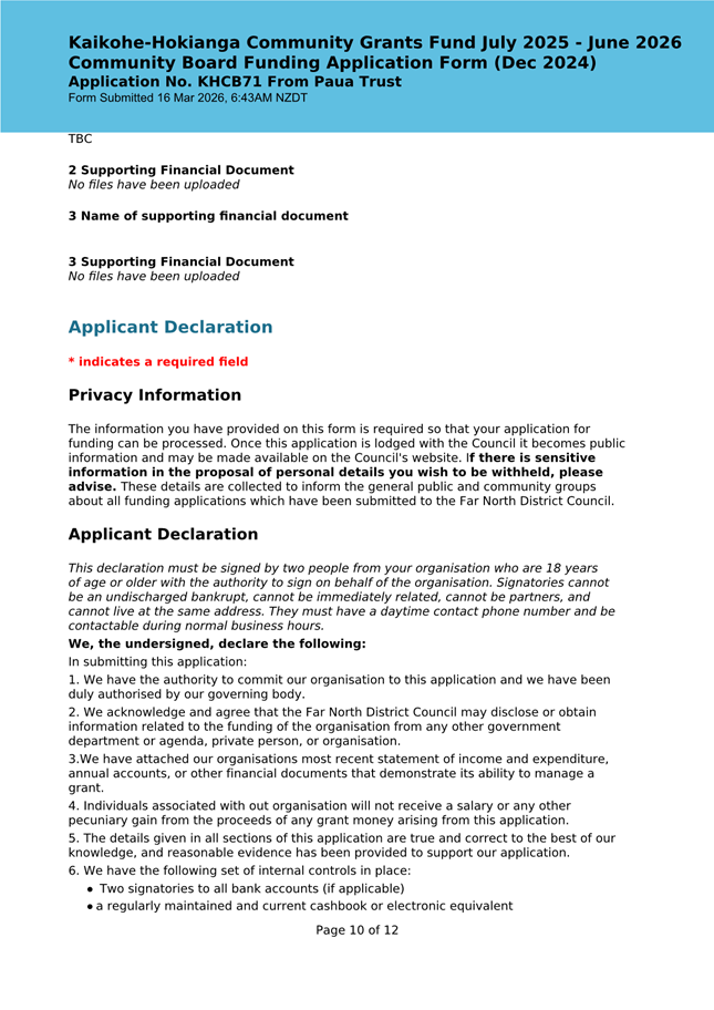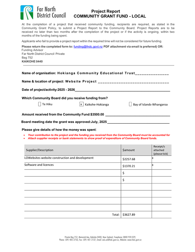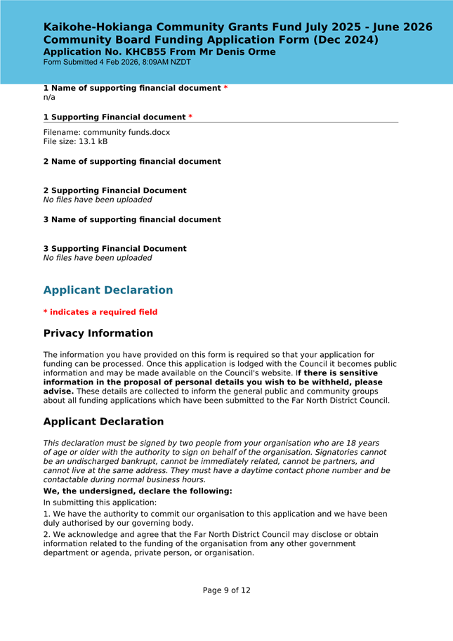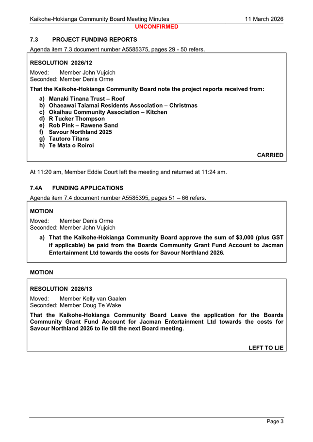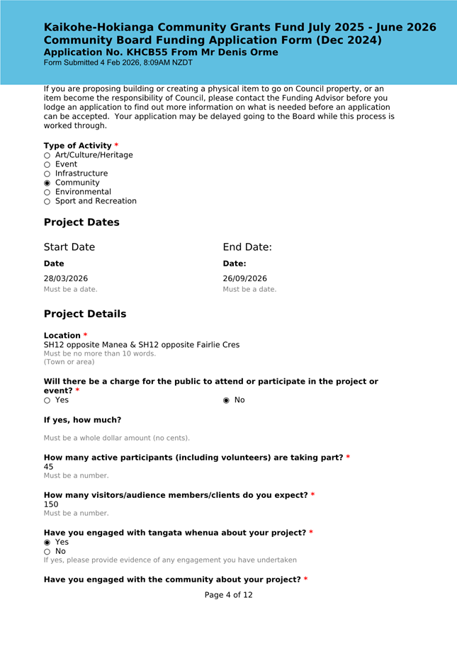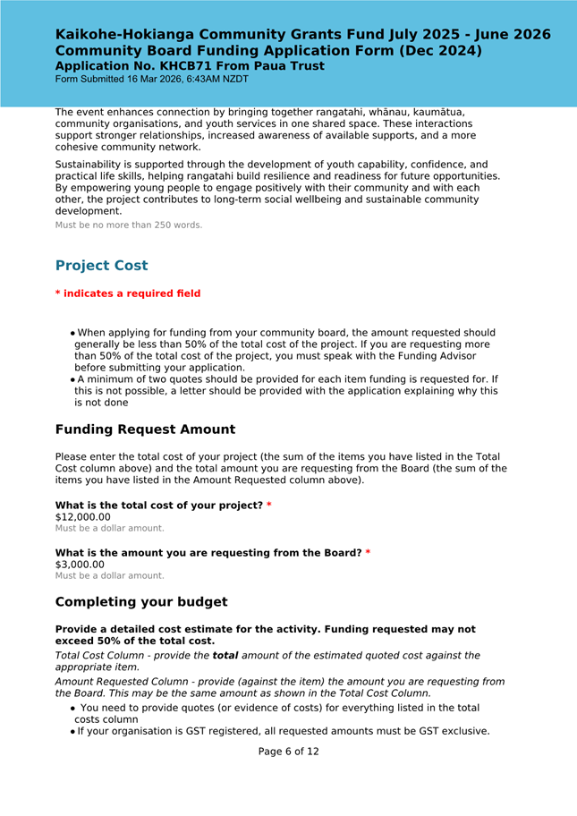 The applicant is seeking funding for the Savour Northland food festival for promotion and events in Kaikohe-Hokianga Ward. The Board granted the applicant $2,106 to the applicant for the 2025 festival. The applicant has been granted $4,000 by Te Hiku Community Board for the 2026 event, and $15,379 for both the 2026 and 2027 event by Bay of Islands-Whangaroa Community Board (both from their 2025/26 funding budget. This application was left to lie at the March 2026 meeting and the applicant has provided additional supplementary information which is included in the confidential information circulated to the Board under separate cover. This meets community outcomes 2,3,4,5 |