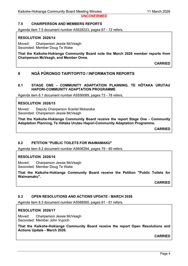 Resource Consents have been emailed to community board members. Members have five days to send feedback in relation to a resource consent. Members will be expected to include these details in their member reports going forward.