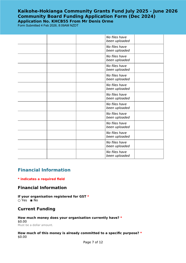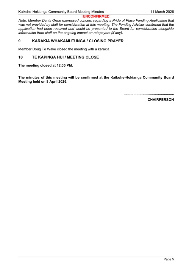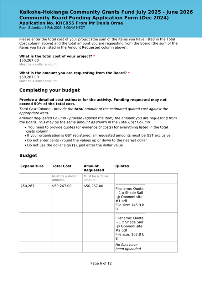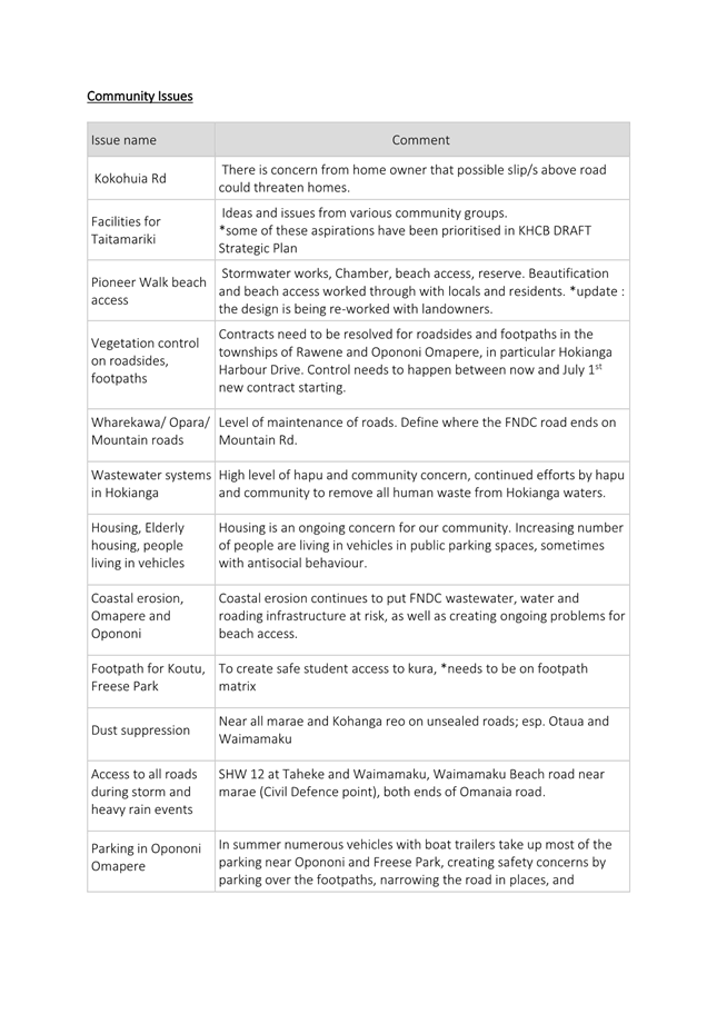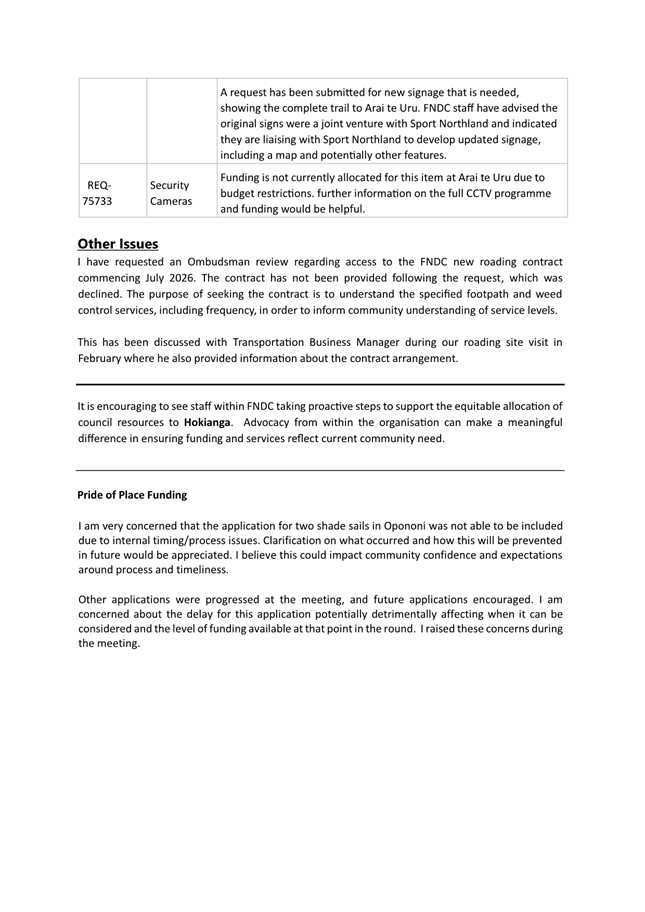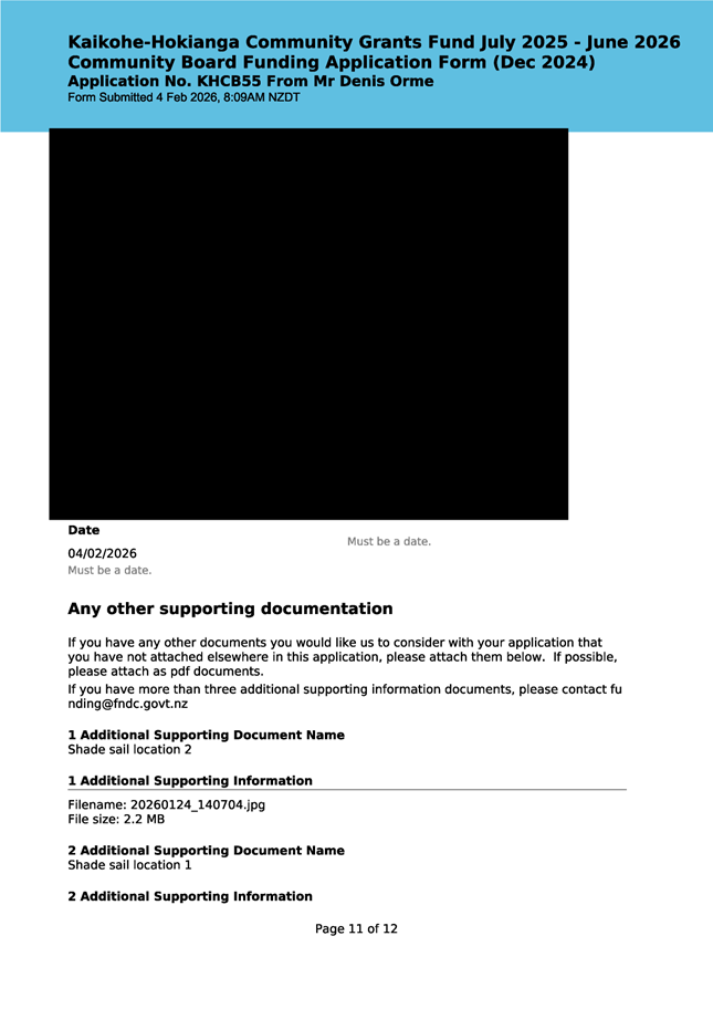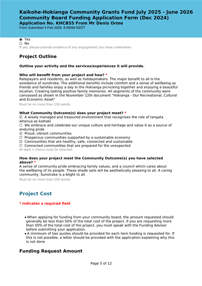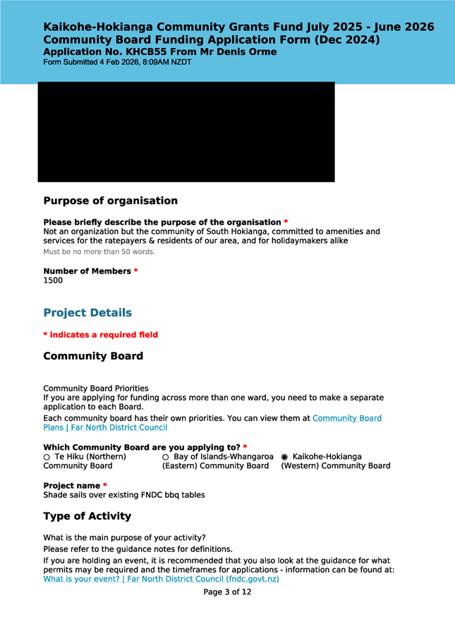 The applicant is a member of the Kaikohe-Hokianga Board, but has made this application as an individual member of the community. The request has been made to install shadesails over FNDC owned picnic tables in the Hokianga. The request was taken to the District Facilities team and FNDC Asset Managers for their input. At this time, they state that they are unable to support this request and are not in a position to take on any unbudgeted assets on Council land. They have recommended that it needs to go to Council as an item to be included in the LTP, at which time, if it is accepted, they can consider the project. (This is included in the confidential supporting information circulated under separate cover). It is noted that this is not one of the 12 priorities the Board has put forward for Council to include in the AP/LTP, although this does not preclude Mr Orme putting it forward in a private capacity when the AP/LTP is open for public consultation. This meets community outcomes 2,3,4,5 |