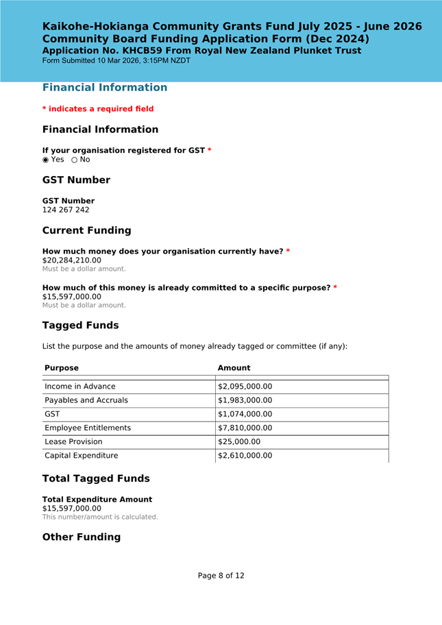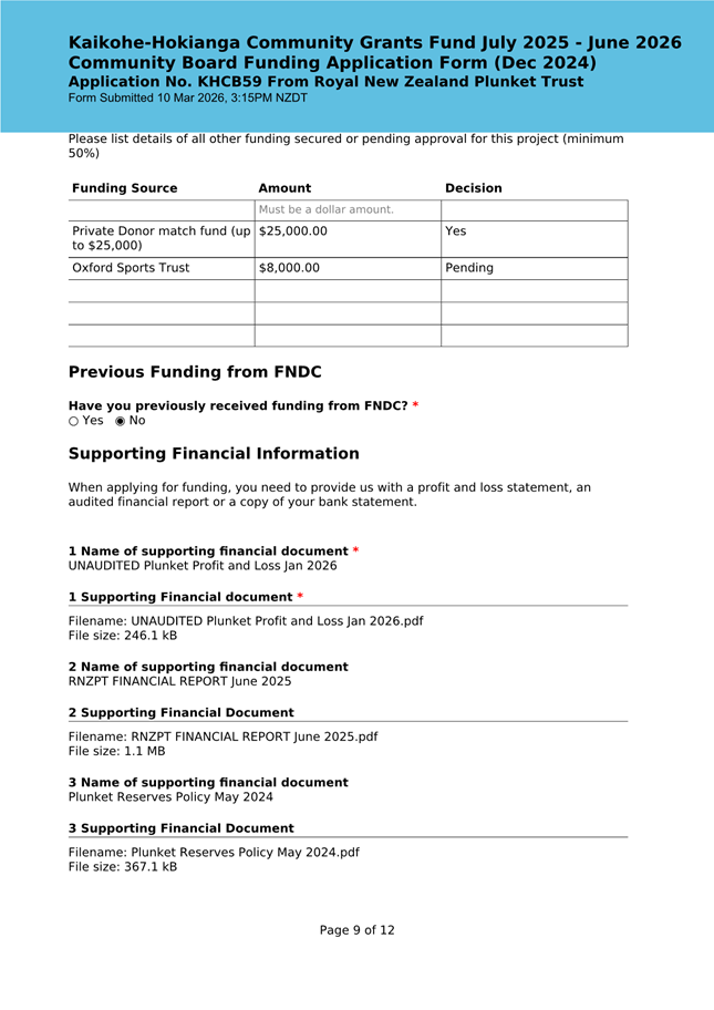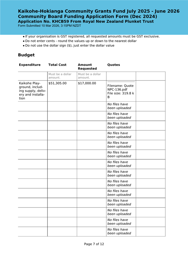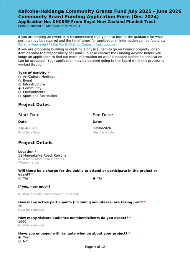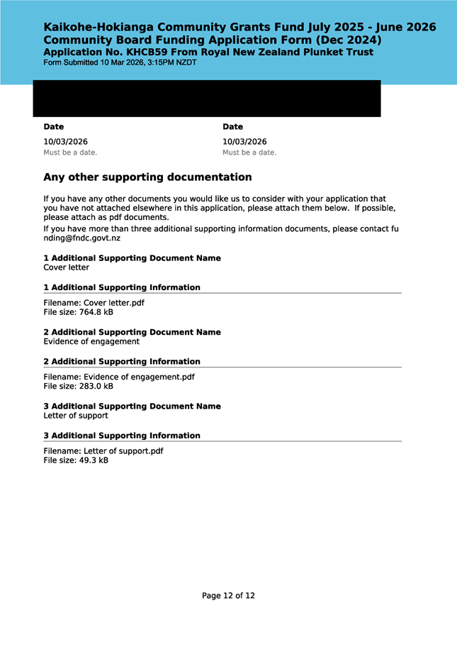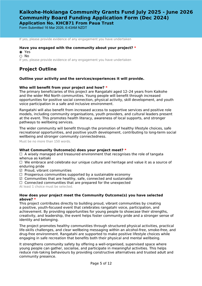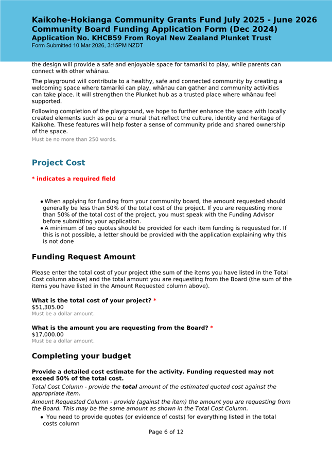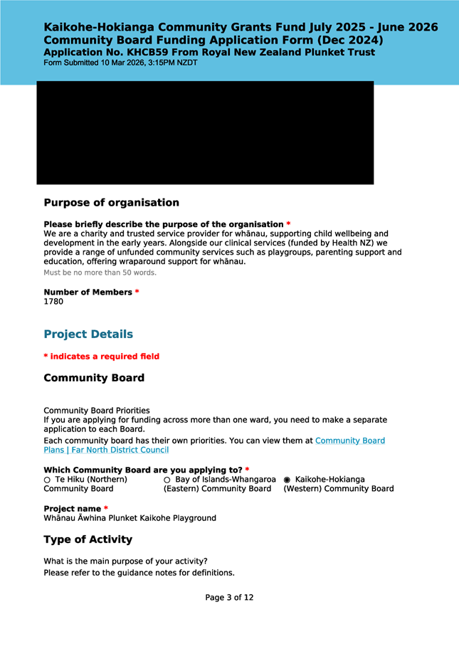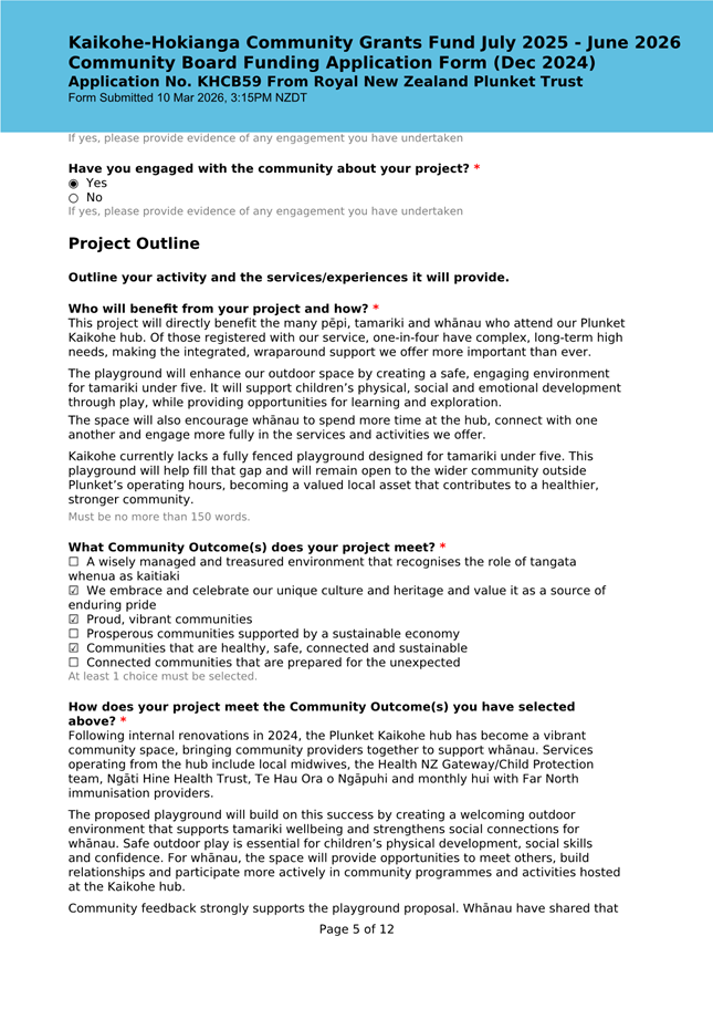 The applicant is seeking funding to upgrade the playground at Kaikohe Plunket to be accessible and usable for tamariki in the area. Significant upgrades were undertaken in 2024 to bring the building up to modern standards, and they wish to now bring the outside area up to the same standard. They note that they have a donor who is willing to match the contribution from the Board up to $25,000. This meets community outcomes 2,3,5 |