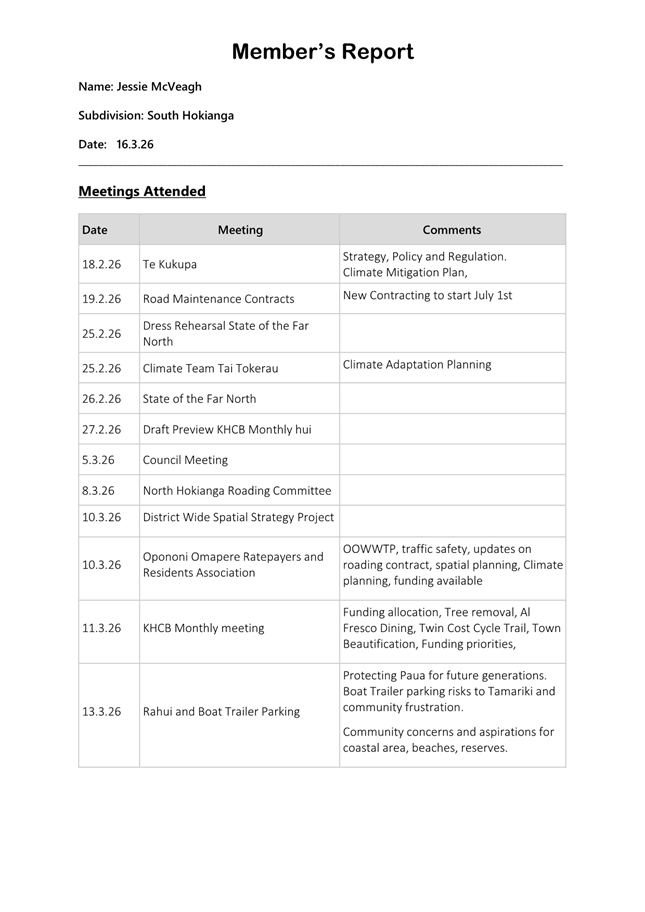 NGĀ TŪTOHUNGA / Recommendation That the Kaikohe-Hokianga Community Board note the August 2025 member report from Chair McVeagh, and Member Orme. |