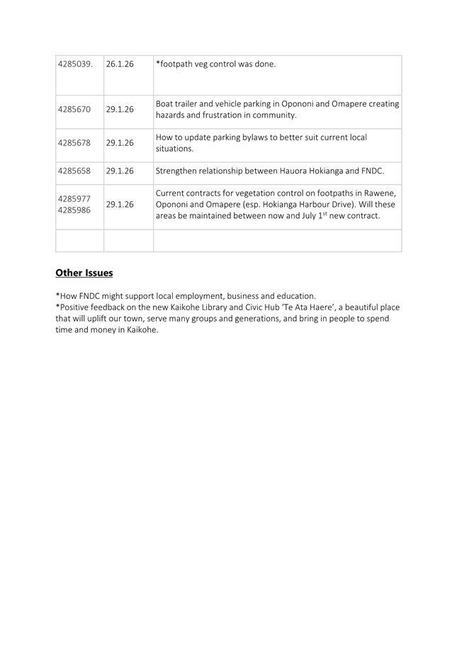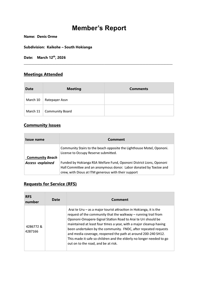 Community Board Coordinators will assist where appropriate, and occasionally, may be in a position to provide a further verbal update at meetings, following the printing of an agenda. Democracy Services staff will support the process by generating reports.